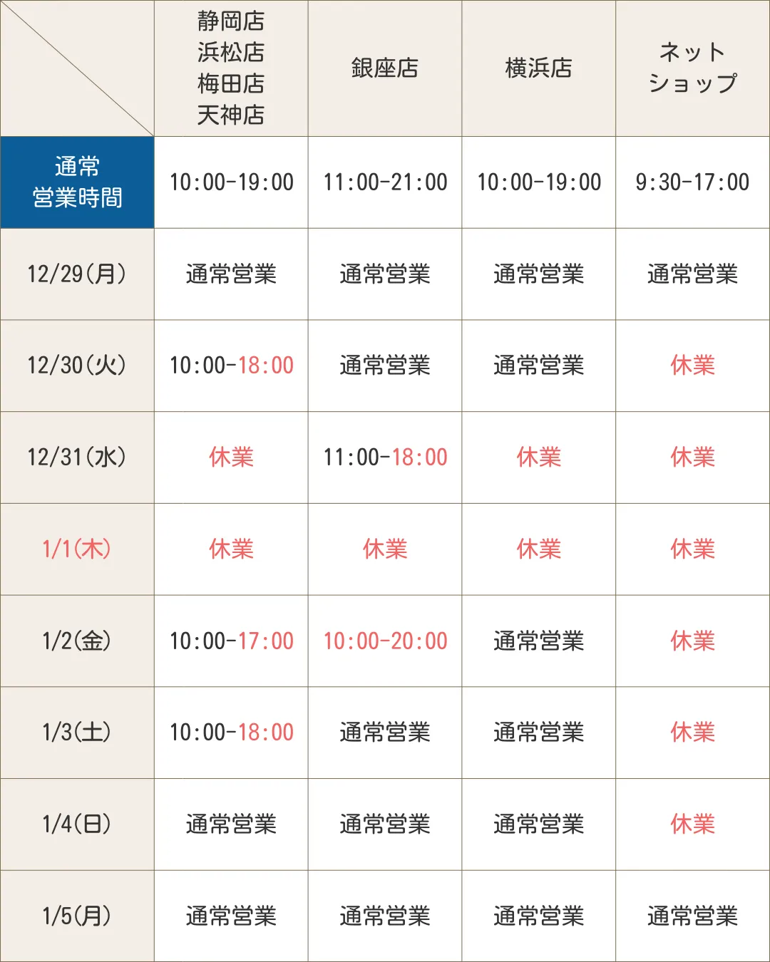 ※弊社実店舗(静岡・浜松・梅田・銀座・横浜みなとみらい・福岡天神店)の年末年始休業日と営業時間については、下記をご確認ください。