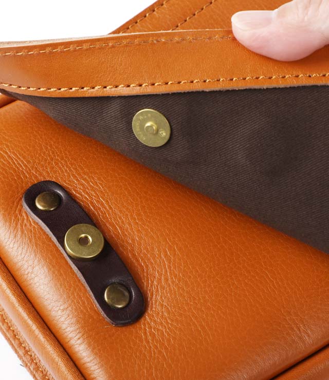 ショルダーベルトの表地にも本体と同じ牛革をあしらいました。同色のベルトは落ち着いた雰囲気を演出。